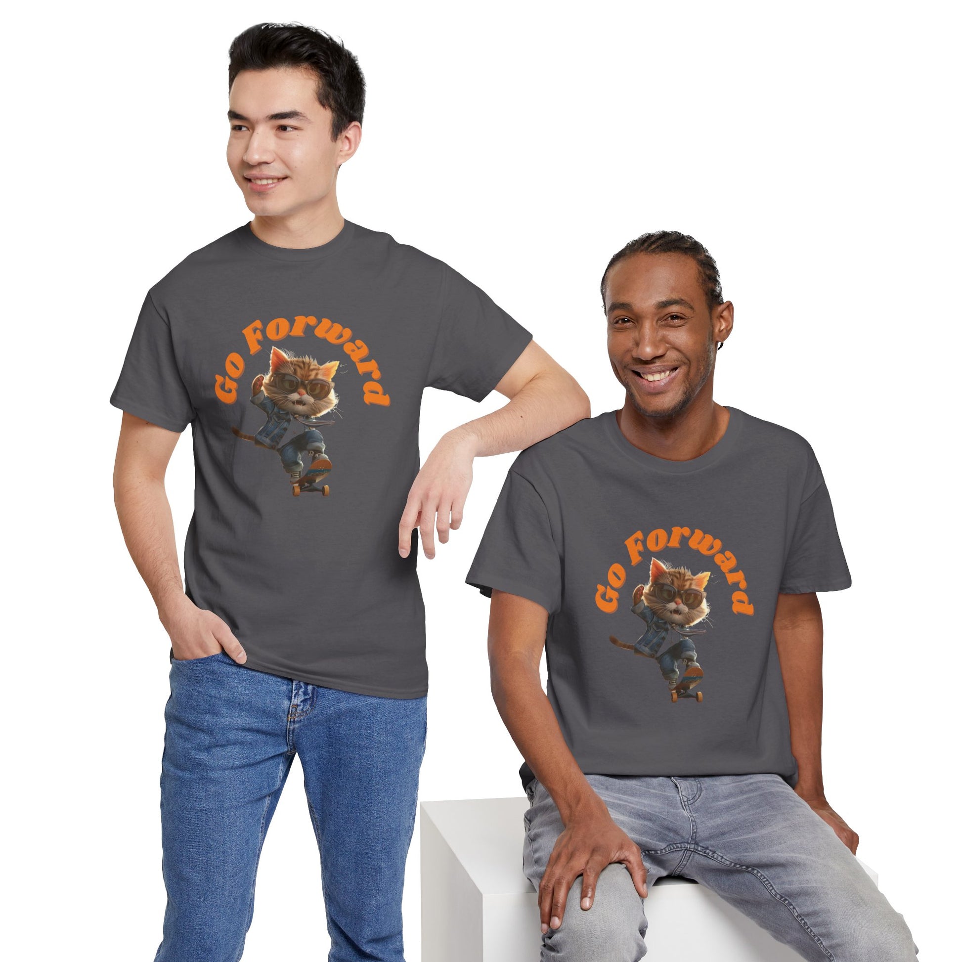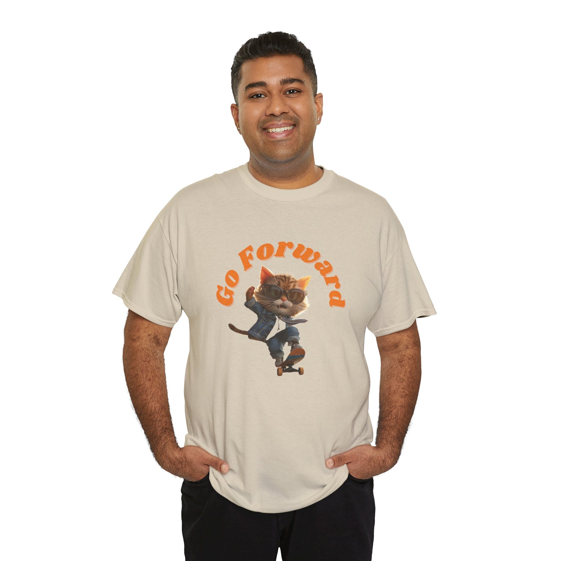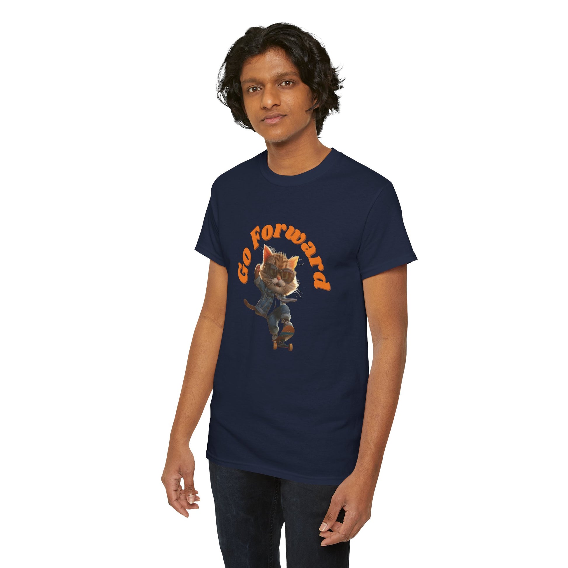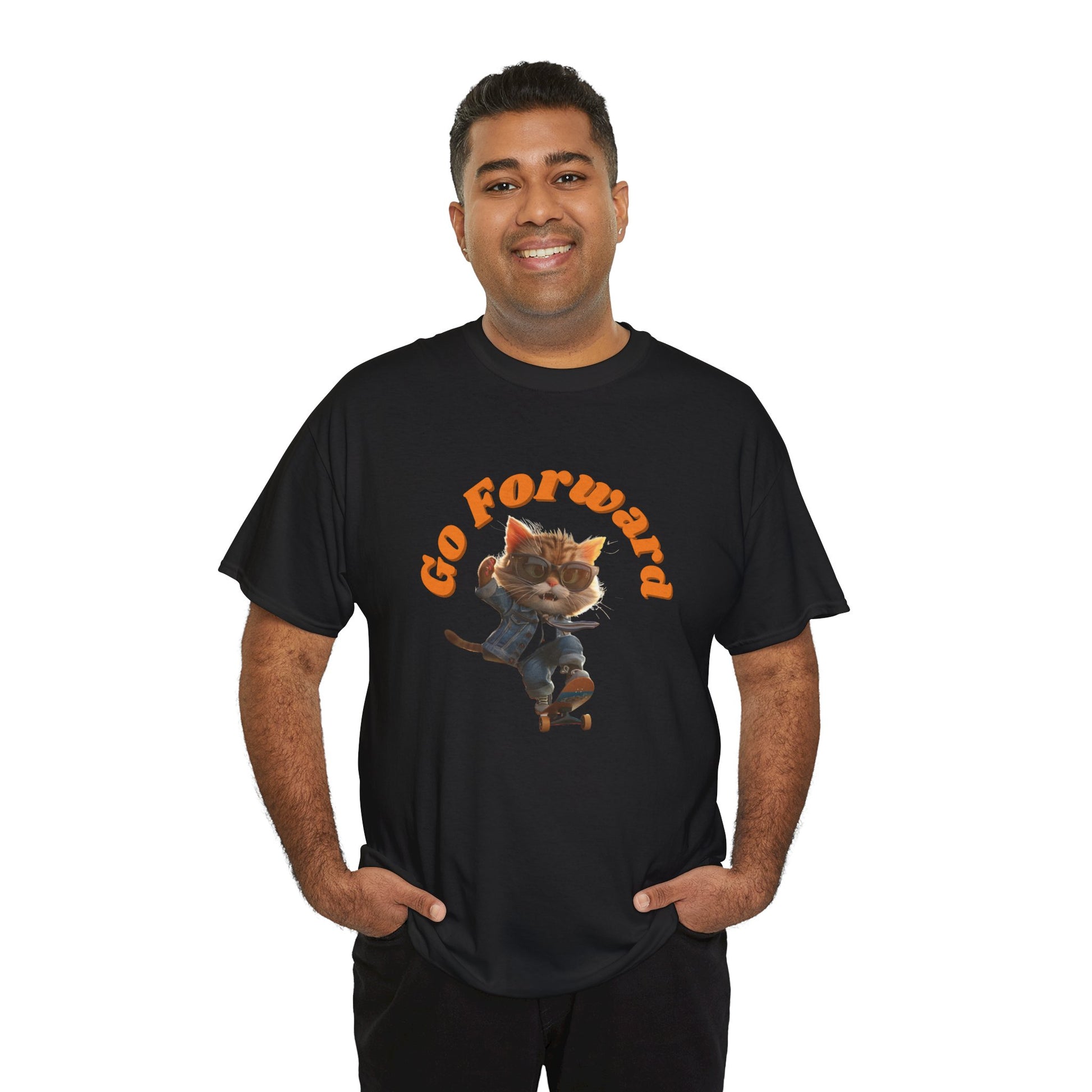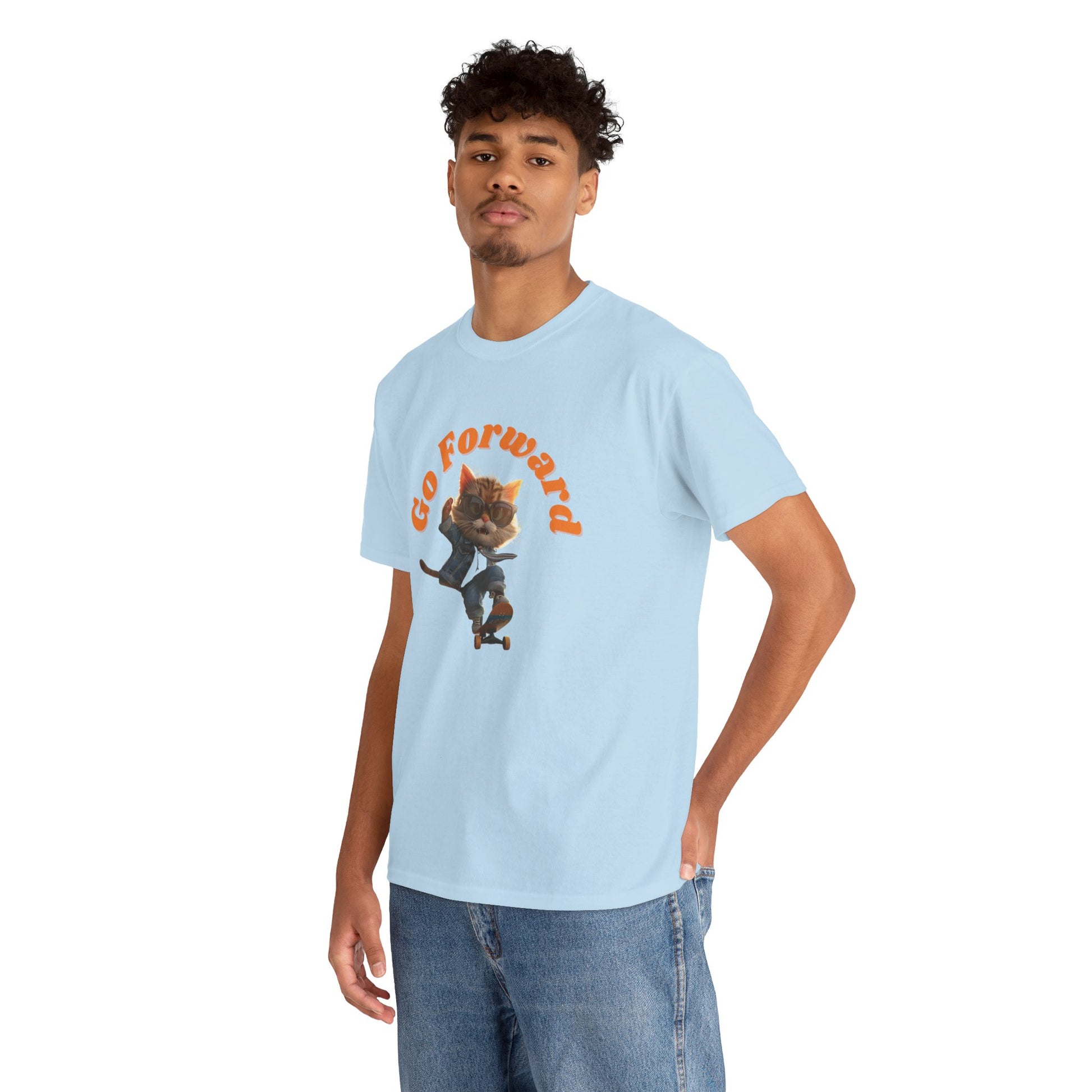 Capture that adventurous spirit with this trendy T-shirt featuring a cool cat wearing sunglasses, denim outfit, and skating forward with style. The 'Go Forward' motivational text adds positive energy, perfect for everyday wear or as a fashion statement. Made from 100% cotton for comfort and durability, this T-shirt is ideal for animal lovers, skateboard enthusiasts, and personality pioneers. Bring unlimited motivation to your wardrobe with this skateboard cool cat tee.